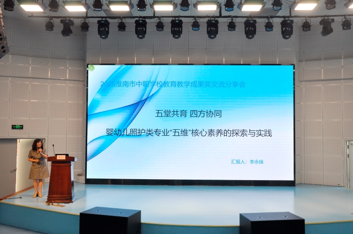 在教学成果交流分享环节,6所荣获市级教学成果特等奖和一等奖的代表学校,依次分享教育教学领域的创新成果与实践经验。淮南世际艺术学校胡宁董事长介绍了中职舞蹈表演专业“岗位导向、德技并修、赛训一体”育人模式的探索与实践;凤台职教中心马登峰老师分享了三全育人背景下中职生赏识教育的实践研究;安徽机械工业学校唐玲老师分享了“立德树人”背景下“四方五育”育人模式的构建与运用;淮南经济技术学校李永妹老师阐述了五堂共育四方协同:婴幼儿照护类专业“五维”核心素养的探索与实践;寿县科技学校郝俊邦副校长展示了双园嵌融、项目进阶:种植类专业群培育乡村振兴“新农人”的教学路径创新与实践;淮南卫生学校高晧老师分享了“党建领航、思政铸魂、德技并修”的卫生职业教育铸魂育人体系的建构与实践。