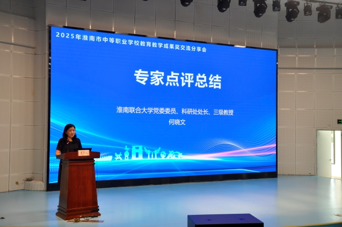 在专家点评环节,淮南联合大学党委委员、科研处处长何晓文分析了本次市级教学成果奖评选的总体情况。从理论高度和实践维度,对本次成果的特色亮点、创新价值和应用前景进行了肯定,特别是从成果选题、成果凝练、成果创新点和成果推广四个方面提出了改进方向,并提出“三个聚焦”建议:聚焦类型教育特征、聚焦产教融合痛点、聚焦学生可持续发展,为各校下一步优化成果提供了专业指导。同时鼓励各校持续深化教学改革,发挥好优秀教学成果的引领、示范、辐射、带动作用,进一步提升人才培养质量。