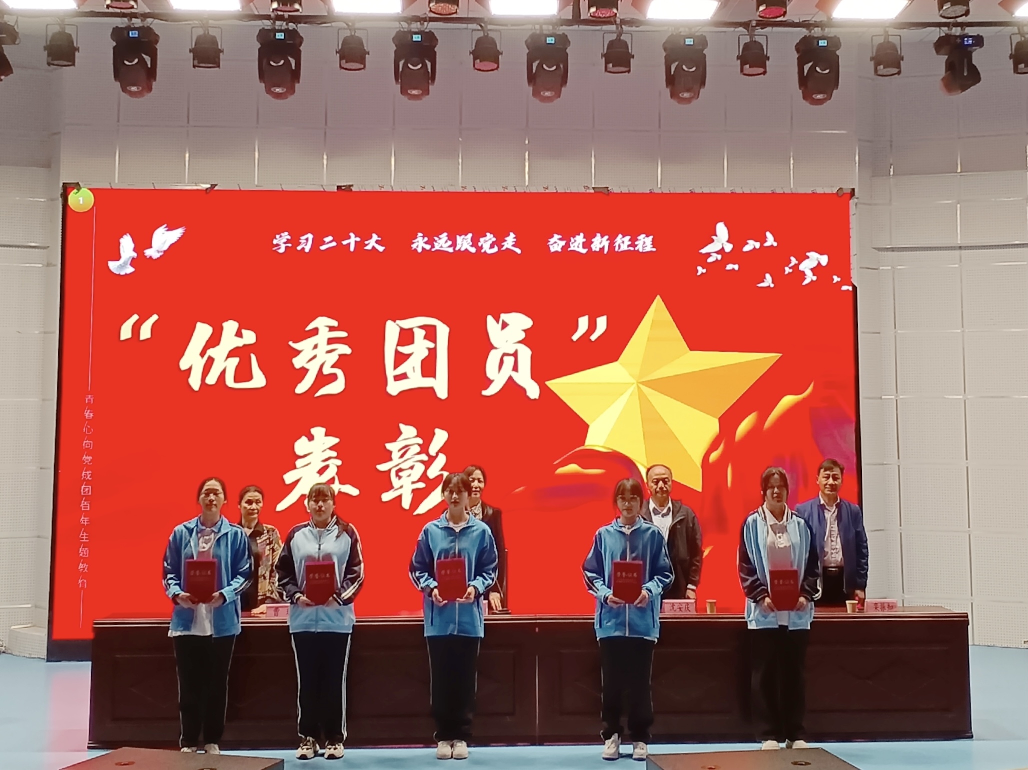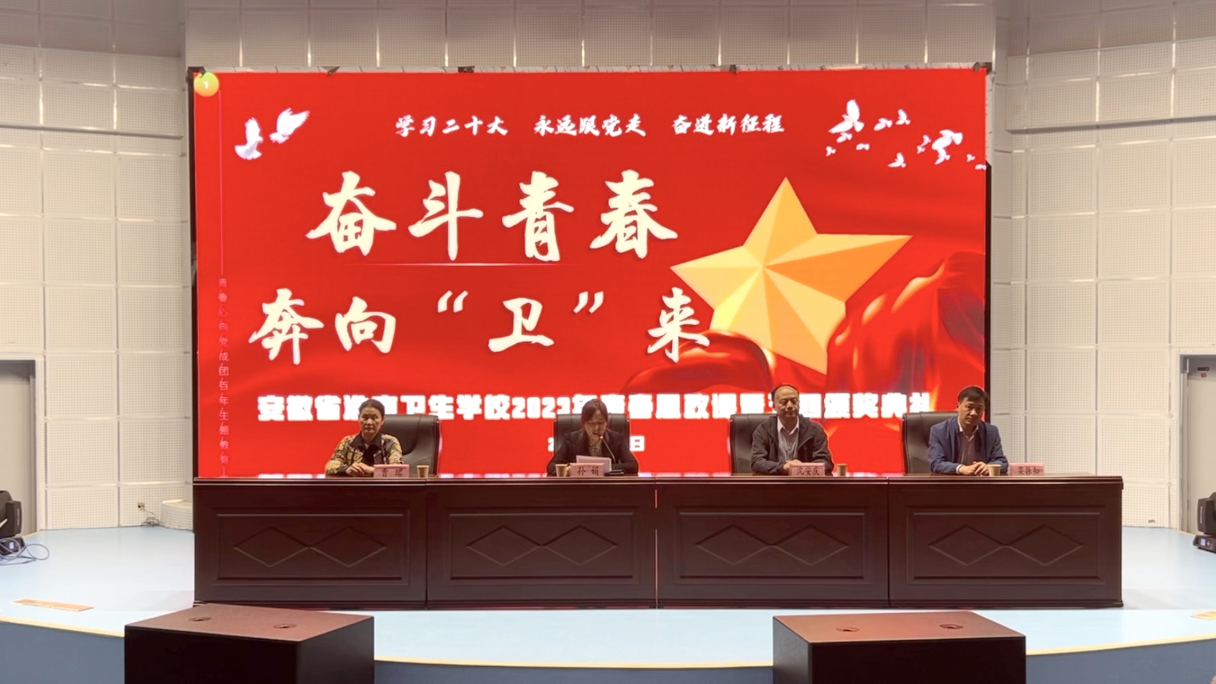 为深入学习贯彻党的二十大精神,充分发挥青年先进典型模范带头作用,2023年5月4日下午,淮南卫生学校在活动中心报告厅隆重举行了“奋斗青春,奔向‘卫’来”2023年青春思政课暨五四颁奖典礼,对在2022年度学校各级团组织中涌现出的优秀青年进行表彰。校党委书记孙娟、副校长沈安庆、纪委书记曹珺、副校长栾振知等领导及老师,校团委全体干部、全校团员及入团积极分子等600余人出席大会。