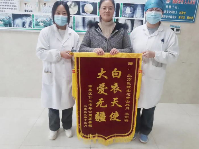 2023年7月8日,淮南市潘集区政协原副主席、党组副书记朱继桓,亲自给北方医院普外科实习护士邱月送来一面闪闪发光的锦旗,上面写着:“赠时代楷模邱月,热心相助,品德高尚”。他感谢淮南卫生学校和北方医院培养出这么优秀的护士!
